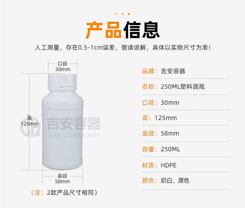 小口塑料瓶采用全新HDPE塑膠原料吹塑而成,具備韌性好、耐酸堿、耐腐蝕、不變形,密封性能佳等特點(diǎn),可根據(jù)客戶需求定制、改色、產(chǎn)品適用于化工、清洗劑、醫(yī)藥、液體、食品、農(nóng)業(yè)等各行業(yè)包裝。